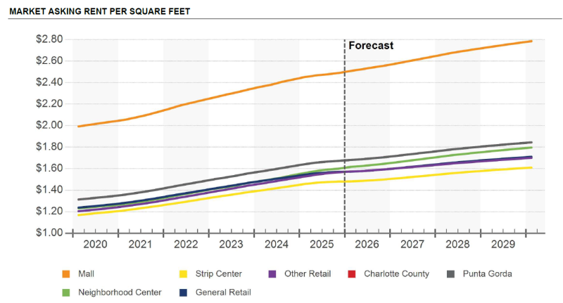 Market asking rents in Charlotte County are currently $20.00 per square foot, reflecting year-over-year growth of 2.4%, consistent with the broader Punta Gorda market .